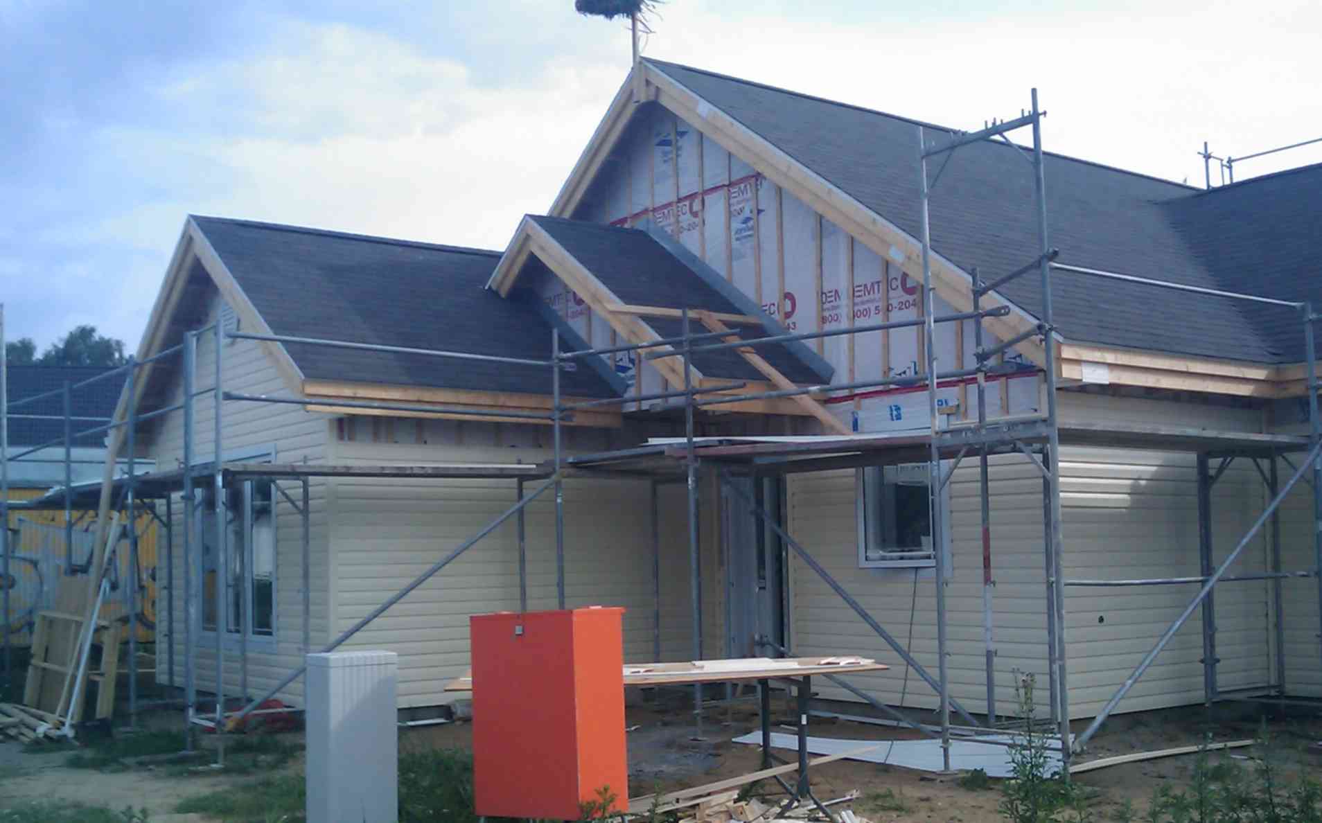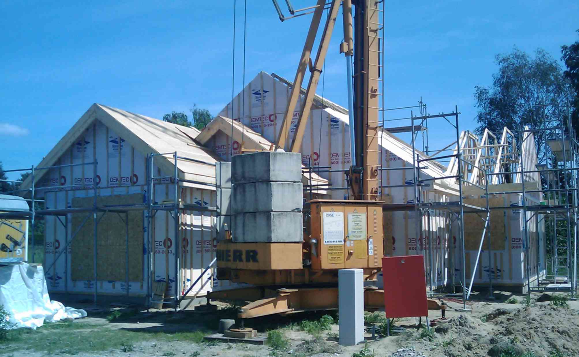 In Falkensee bei Berlin wurde ein weiteres Nordamerikanisches EFH erstellt. Der Baufortschritt wird hier dargestellt. Hier ist nach 5 Tagen die Bodenplatte inkl. Erdarbeiten erstellt und der Aufbau der Holzkonstruktion in Ausführung.